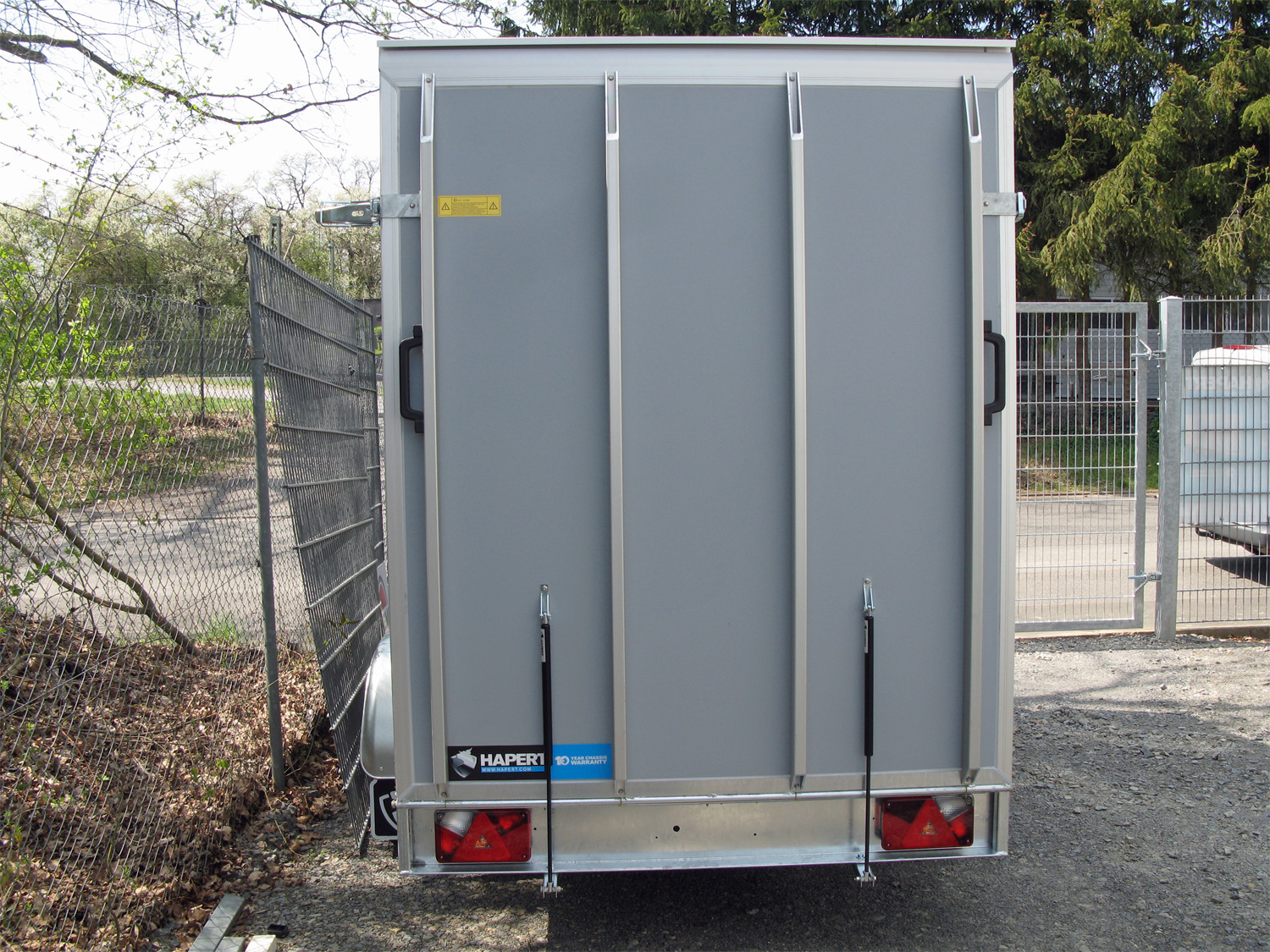 Der Hapert Sapphire L-2 – 2000 ist ein robuster Tieflader-Kofferanhänger, ausgestattet mit einer rutschhemmenden Heckklappe mit Gasdruckfedern für komfortables Be- und Entladen.