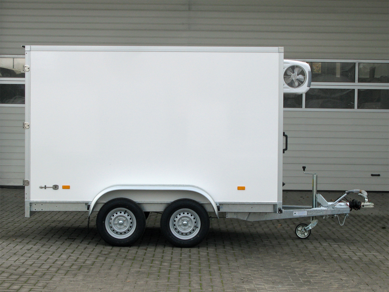 Dieses Modell ist serienmäßig mit hochwertigen Isolierplatten versehen, die aus zwei Deckschichten aus Polyester, einer zweifachen Holzeinlage und einem Kern aus Isoliermaterial bestehen. Edelstahl-Scharniere und -Verschlüsse garantieren Langlebigkeit, während das leistungsfähige Kühlaggregat mit 1600 W für optimale Kühlung sorgt. Ein Verlängerungskabel, Innenbeleuchtung und eine abschließbare Bedienkonsole gehören ebenfalls zur Serienausstattung. Die glatten Gelcoat-Außenwände eignen sich ideal für Werbeaufkleber, sodass der Kühlwagen gleichzeitig als mobile Werbung genutzt werden kann.