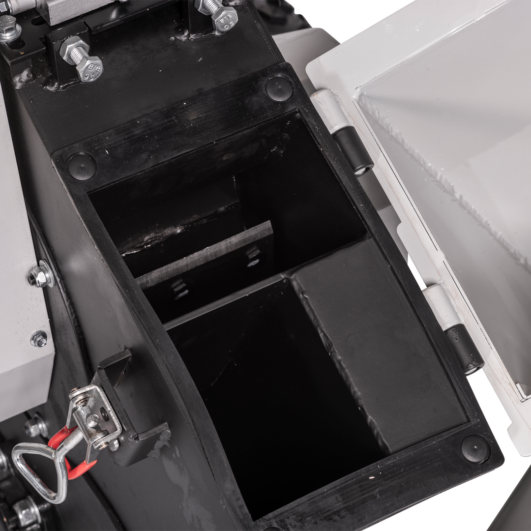 - Einfülltrichter & Auswurftrichter kann zum Reinigen der Messertrommel zur Seite geklappt werden