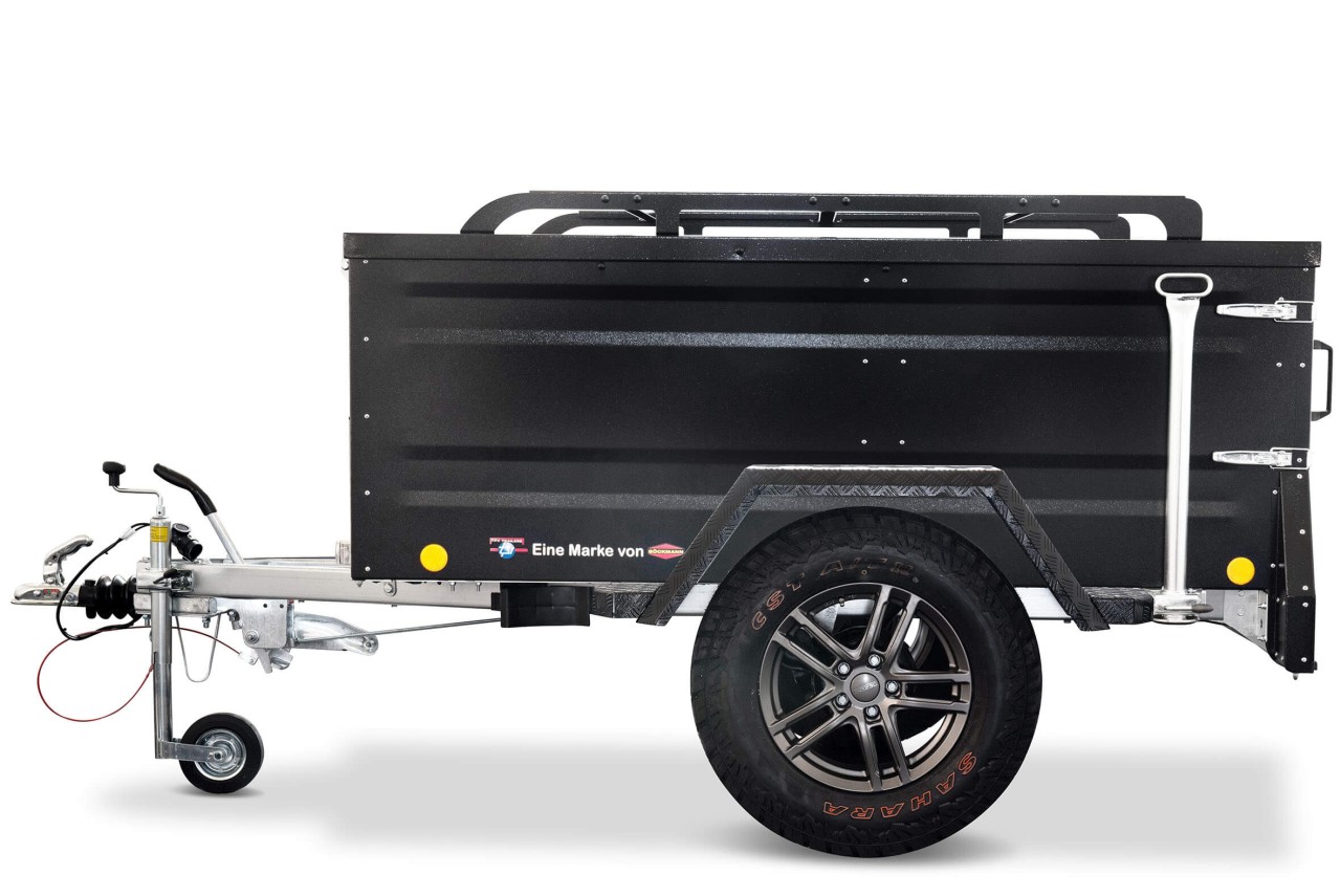 Der Offroad-Kofferanhänger KT-EB2 von Böckmann/TPV ist ein einachsiger, gebremster Anhänger mit einer Zulässigen Gesamtmasse von 1000 kg. Der schwarze, pulverbeschichtete Deckel ist spritzwassergeschützt und abschließbar. Serienmäßig mit einer Reling ausgestattet, ermöglicht er die problemlose Montage von Fahrradträgern oder Dachboxen.