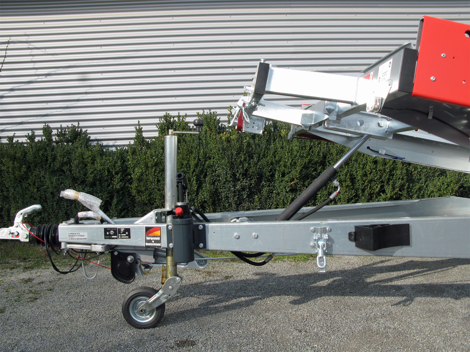 Die hydraulische doppelwirkende Handpumpe erlaubt ein problemloses An- und Abkippen des Anhängeraufbaus, während die Multifunktionsbeleuchtung mit einem Handgriff umklappbar ist. Die signalrote Pulverbeschichtung an den Bordwänden sorgt für zusätzliche Sicherheit.
