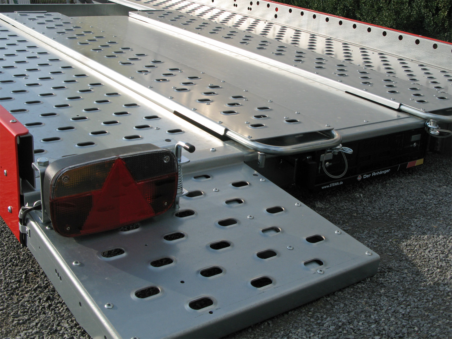 Dank der extra breiten, gelochten und rutschfesten Laufschienen aus Zinkblech mit Langlöchern für Spanngurte wird der Transport von Fahrzeugen mit verschiedenen Radständen erleichtert. Zusätzlich ermöglichen die angebauten Auffahrschienen ein müheloses Be- und Entladen.