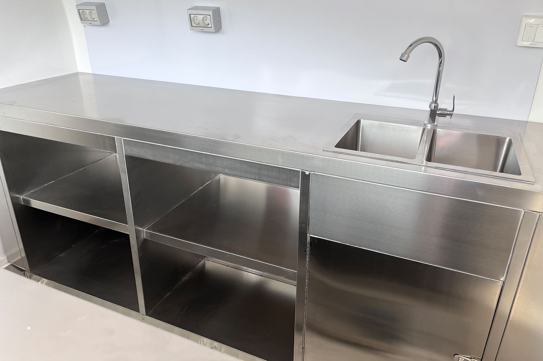 - Innenausstattung: Beidseitige Regale, Spülenschrank und Hochregal in VA